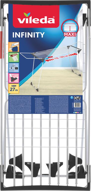 Roztahovací ocelový sušák VILEDA INFINITY s maximální sušící plochou 27 m. Chytré a snadné použití: díky centrálním drátům, které lze prodloužit až na 189 cm, je vhodný pro každodenní prádlo nebo pro sušení velkých předmětů, jako jsou prostěradla a ubrusy. S bočními křídly dosahuje maximální rozměr až 257 cm, což vám pomůže optimalizovat prostor pro sušení podle vašich potřeb. Velmi snadno vysušíte velké množství prádla, ale také spodní prádlo a ponožky díky držáku pro malé předměty. Silné centrální dráty zabrání mačkání prádla, což následně zkracuje čas žehlení. Rovnoběžné ocelové nohy sušáku zaručují větší stabilitu a robustnost výrobku a jejich speciální kloub zabrání jakémukoli náhodnému uzavření, i když sušák přesouváte. Rozměr rozložený (š x h x v): 186-257 x 57 x 100 cm. Rozměr složený (š x h x v): 57 x 12 x 117.5 cm . Sušící plocha: 27 m. Ideální pro ubrusy a prostěradla, délku centrálních drátů lze nastavit podle potřeby a sušák dosahuje maximální rozměr až 257 cm . Velmi komfortní pro velké a dlouhé prádlo díky 1m výšce sušáku. Silné centrální dráty, které zabrání mačkání prádla. Robustní a stabilní, což zajišťují extra bezpečné a stabilní nohy. S držákem pro malé předměty, kolečky pro snadné přemisťování a zámkem křídel pro bezpečné skladování při sušení prádla se smí používat venku, nicméně skladovat doporučujeme sušák uvnitř (v suchu a mimo slunečního záření).