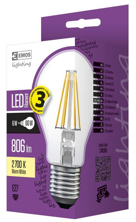 Žárovka LED FLM A60 A++ 6W E27 WW - barva světla: teplá bílá, kategorie/řada: FILAMENT, technologie: LED, startovací doba: 0,1 s, index podání barev (CRI): Ra >80, účiník: 0,5, světelný tok/svítivost: 806 lm, počet čipů: 6, prodejní obal: 1 ks, krabička, rozměr: 60 × 110 mm, příkon: 6 W, tvar: Classic A60, napětí: 230 V~/50 Hz, světelná účinnost: 134 lm/W, životnost: 25 000 hodin, typ čipů: COB, patice (uchycení žárovky): E27, teplota chromatičnosti: 2 700 K, stmívatelná: ne, úhel vyzařování: 360°, záruční doba: 3 roky, energetická třída: A++, počet spínacích cyklů: 15 000, náhrada za žárovku: 60 W