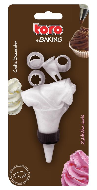 Zdobička dortů se skládá z dávkovače a čtyř různých nástavců. Vhodné pro přípravu sušenek a zdobení dortů. Materiál - plast, plátno. Objem dávkovače je 1200 ml. Velikost nástavce - 2,5 cm.